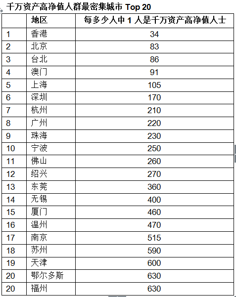 数据显示,香港是高净值人群最密集城市,每34人中就有1人是千万富豪,其次是北京,每83人中有1人是千万富豪。前五大高净值人群最密集城市中还有台北、澳门和上海。深圳、杭州、广州、珠海和宁波均在前十之列。
