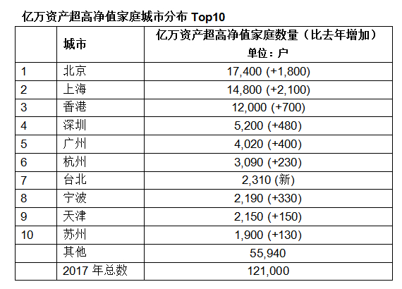 报告指出,北京仍然是拥有最多亿万资产超高净值家庭的地区;广东第二;上海第三;香港、浙江并列第四。