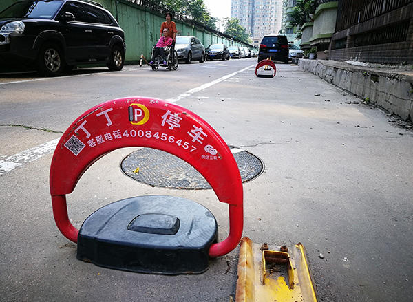 2017年8月30日,北京,一部分业主在车位上安装了椭圆形的共享车位装置。 东方IC 图