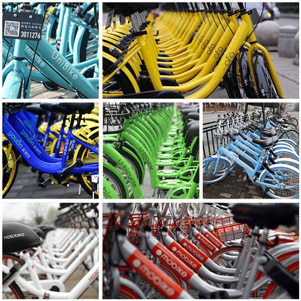 摩拜、ofo、小鸣、Hellobike等各种品牌的共享单车涌入城市街头,被网友戏称为“七彩中国”。 东方IC 图