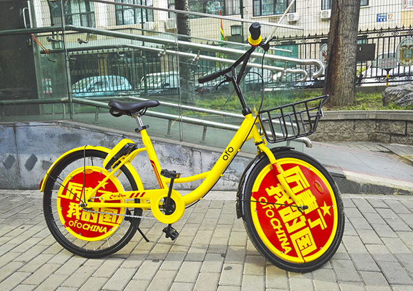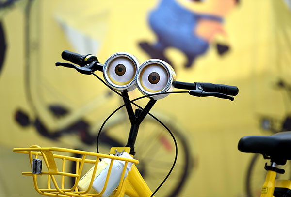 2017年7月8日,河南洛阳一个商圈门口,“小黄人版”ofo大眼萌车。 东方IC 资料图