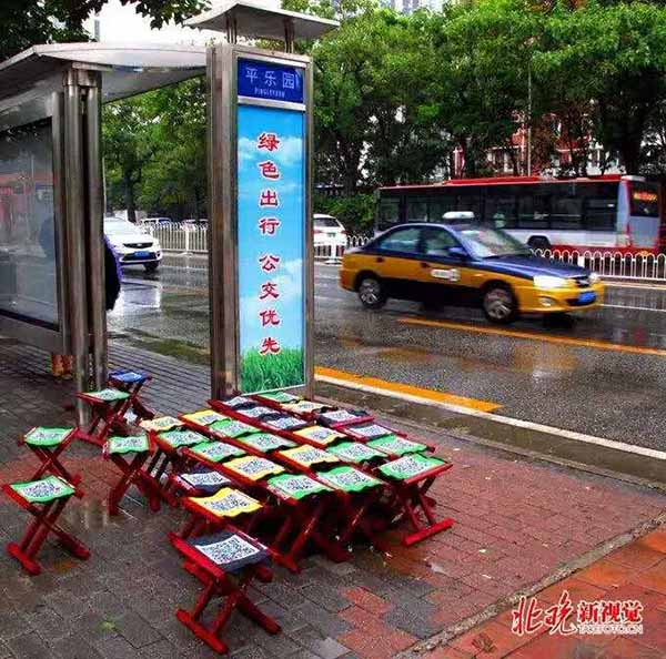 2017年8月,网友在北京某公交车站发现的“共享马扎”。 北京晚报新视觉 资料图