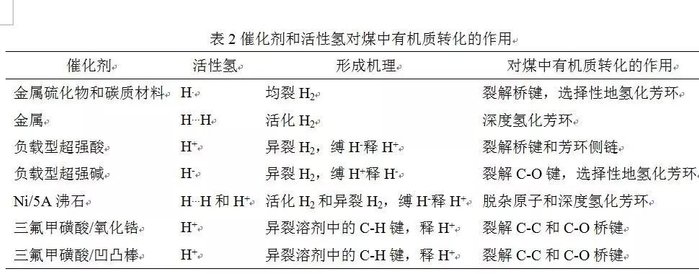 采用如图1所示的逐级解离/解聚的方法较深入地揭示了煤有机质中典型的缔合/键合作用(表1),阐明了4种典型的活性氢的形成机理及其对煤转化的作用(表2),为解决上述核心科学问题提供了重要的依据,即煤有机质中的少量芳环以可溶的芳香族化合物的形态存在,绝大部分芳环以常温下难溶的大分子的形态存在,其中芳环之间由桥键连接,芳环上还含有侧链;芳环种类不同、连接芳环的桥键不同和芳环上的侧链导致煤中有机质大分子的结构十分复杂,但如果能够设法完全切除芳环上的侧链和切断连接芳环的桥键而留下非取代的可溶芳香族化合物,则可以在很大程度上解决后续分离困难的问题,获取一系列芳香族化合物纯品。