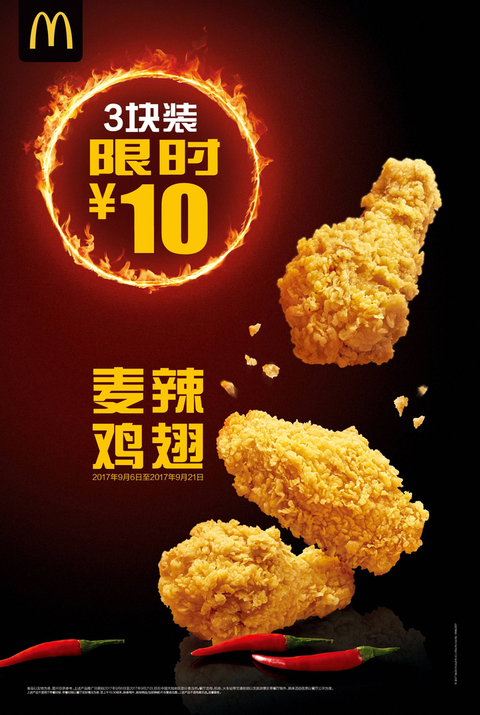 (*食物以实物为准,图片仅供参考。17元起超值工作餐是指上述任意一款指定汉堡搭配任意中杯汽水或指定饭搭配中杯FUZE tea柠檬红茶味饮料17元起。17元起超值工作餐自2017年3月29日起仅限周一至周五等工作日(法定节假日除外)早餐后供应,早餐供应时间以餐厅实际为准,至上午10:30结束。那么大鸡排满碗饭和蜜汁鸡腿满碗饭供应到晚上11点为止,17元起超值工作餐仅在中国大陆部分麦当劳餐厅使用,机场、火车站等交通枢纽餐厅、旅游景区餐厅等特殊餐厅除外,不适用于麦乐送送餐服务,具体以店内公示为准。“Coca-Cola”、 「可口可乐」、“FUZE tea”、FUZE tea柠檬红茶味饮料是可口可乐公司商标。麦辣鸡翅限时10元3块活动推广日期自2017年9月6日至2017年9月21日,仅在中国大陆地区部分麦当劳餐厅适用,机场、火车站等交通枢纽以及旅游景区等餐厅除外,不适用于早餐时段,不适用于麦乐送送餐服务,具体活动信息以餐厅公示为准。)