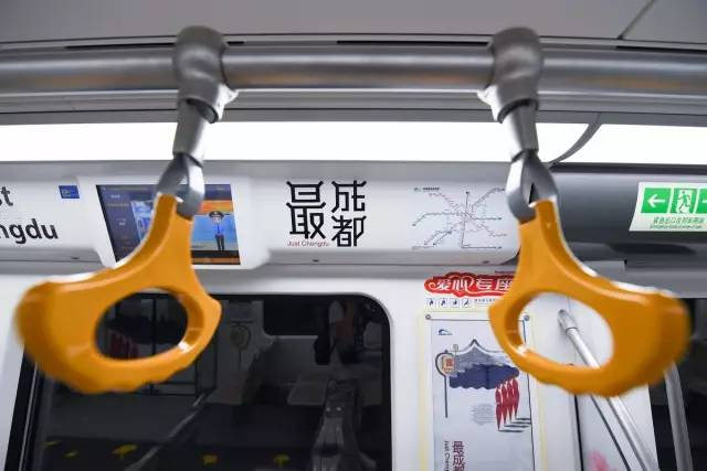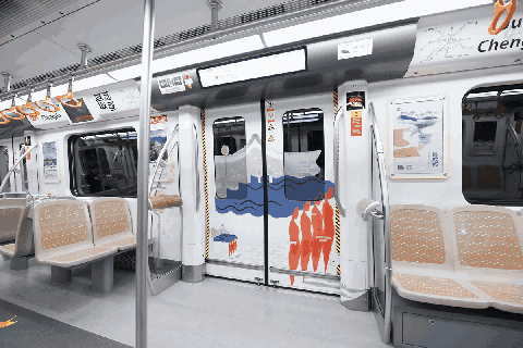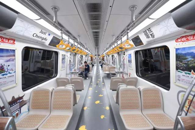 不仅如此,随车摇曳的银杏叶形状拉手、散落在座椅间的芙蓉花贴及特制古风画框,列车由内至外营造出最具成都韵味的主题列车。