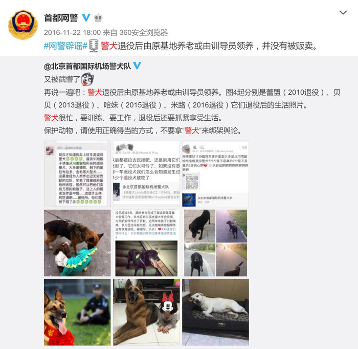 对此,北京首都国际机场警犬队发布微博表示,警犬退役后由原基地养老或由训导员领养,并非网传消息中所说的被宰杀。