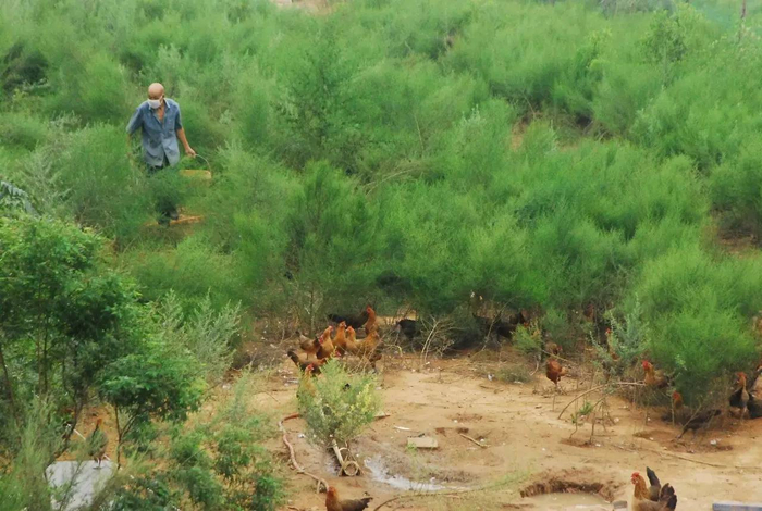 b、生存空间:太行鸡活动半径为200m,充分保证了采食和活动空间,笼养鸡每只鸡的活动空间仅为0.3m。