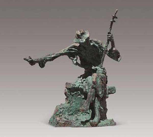 钱绍武创作的《阿炳》,表现的是中国杰出的民间音乐家阿炳(本名华彦钧)。他身前异常凄苦,其创作存世的六首乐曲皆为民乐瑰宝,尤其是《二泉映月》已经成为蜚声世界的经典名曲。这件阿炳塑像没有表现音乐家磨难的面容,而是选取他沉醉于演奏的瞬间,旨在传递其内心的情感。这尊塑像中的阿炳身姿瘦弱,衣衫褴褛,令人怆然。