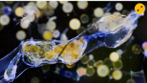 ▲这一浮游箭虫吃下了一根3mm的蓝色塑料纤维,浮游生物支撑着整个海洋食物链。图据Orb