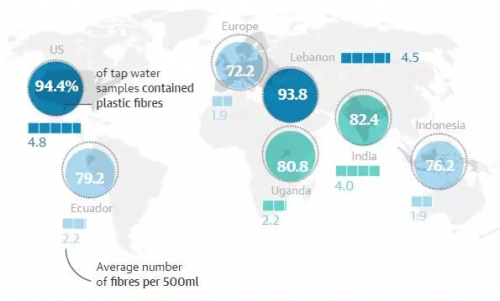 虽然包括英国、德国和法国在内的欧洲国家,自来水污染率最低,但仍旧达到74%。每500ml水样本里存在的塑料纤维平均含量,从美国的4.8到欧洲国家的1.9高低不等。