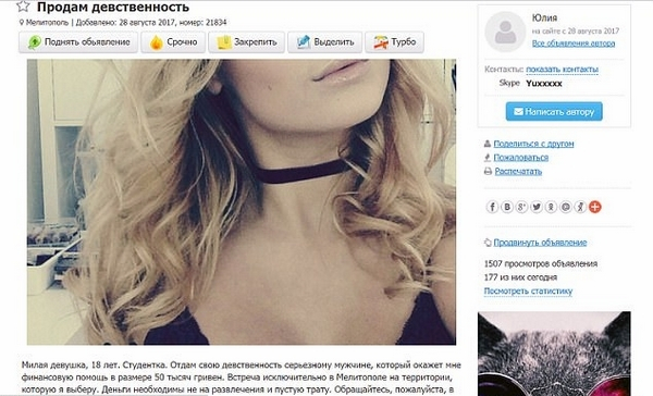 【环球网综合报道】据英国《每日邮报》9月5日报道,近日,乌克兰梅利托波尔市18岁的女孩尤利亚(Yulia)因走投无路,于是便在当地一家报纸上刊登了一则广告欲出售自己的初夜,售价为1500英镑(约合人民币1.3万元)。