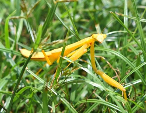 报道称,绿色、茶色的螳螂较为常见,园内负责人表示“黄得这么明灿灿、看起来像金色的螳螂十分稀有,我还是第一次见”,十分兴奋。