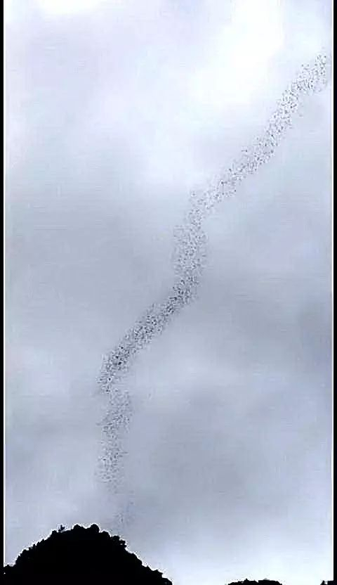 记者在该段视频中看到,成千上万的蝙蝠像一股青烟一样持续“喷”向天空,远望就像一条巨大的黑龙蜿蜒在空中,飞在最前的蝙蝠事后分成两股,宛如一张张开的“巨嘴”。