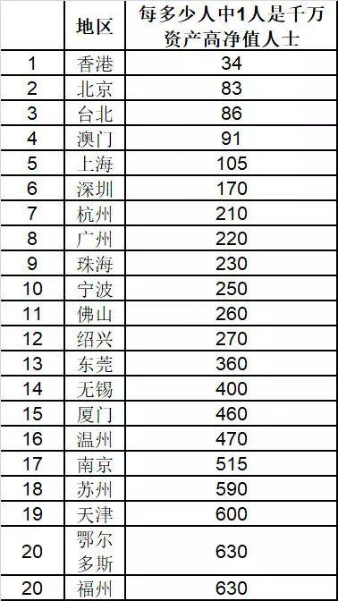 在香港,每34人中就有1人是千万级高净值人士,在北京,每83人中就有1人;在台北,每86人中也会有1人,在澳门,每91人你或许也会遇到一位。
