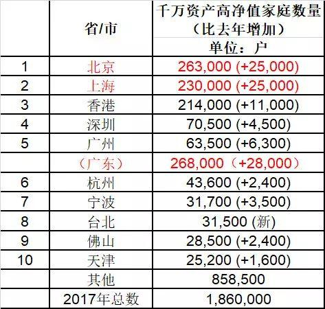 北京第二,千万资产高净值家庭比去年增加2.5万,达到26.3万,增幅10.5%,其中拥有千万可投资资产的高净值家庭数量有13.4万;