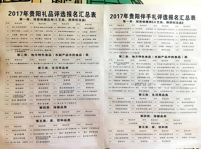 据了解,自2017贵阳市“物爽贵阳”——贵阳伴手礼、贵阳礼品评选活动启动以来,组委会共收到来自全市各地报送的旅游商品共计200余件。根据档次、售价、用途等方面不同,分为伴手礼和礼品两个大类,两个大类中再分别细分为观赏收藏类地方特色工艺品、旅游纪念品,地方特色食品(含农副产品中的食品),生活用品,保健品,茶、饮料品共大类。