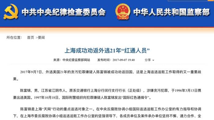 2017年9月7日,外逃美国21年的贪污犯罪嫌疑人陈富锦被成功劝返回国,这是上海追逃追赃工作取得的又一重要战果。