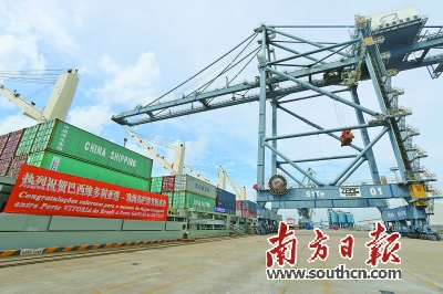 这是珠江西岸通往巴西的首条海运航线,也为中巴物流海上“丝绸之路”再添新通道,标志着中巴两国物流进一步深化合作迈出关键一步。