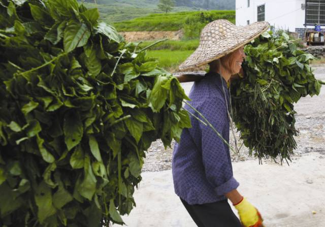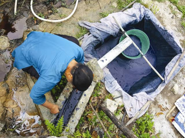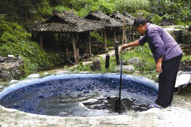 当地人将板蓝根作为制作染料的原材料浸泡水中。
