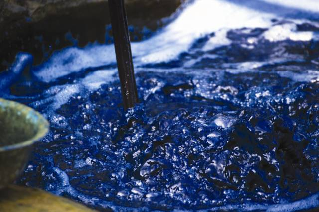 我国人民在长期实践中,已逐渐摸索出制取蓝靛的关键技术,从而打破了蓝草染色的季节限制。古人造靛是先将刈蓝倒竖于坑中,加水过滤,将滤液置于瓮中,再按比例加入石灰,用木棍急剧击水,让水中的靛甙与空中氧气的接触,使之氧化成为靛蓝。沉淀后,将水除去,等靛蓝的水分完全蒸发,则可将其盛到容器内,等它慢慢凝结制成蓝靛。这种造靛和染色的技术,与现代合成靛蓝染色的机理是完全一致的。