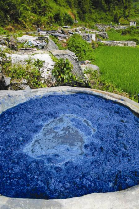 当地人用蓝靛染洗自家纺的白布。