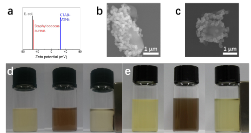图2 (a)Janus MSNs电势图、Janus MSNs捕获(b)大肠杆菌和(c)金黄色葡萄球菌的SEM照片、外部磁场作用下Janus MSNs对大肠杆菌(d)和金黄色葡萄球菌(e)悬浮液(约107 CFU mL-1)抑菌和分离的光学照片。