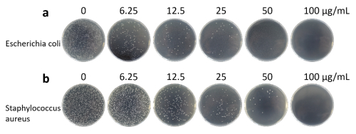 图3 不同浓度CTAB担载氨基修饰的磁介孔纳米粒子分别对大肠杆菌(a)和金黄色葡萄球菌(b)的抗菌活性平板实验的光学照片。