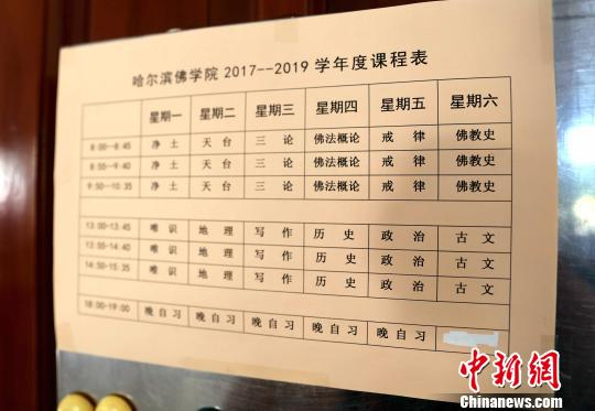 当天,记者还在学院教室内看到了“哈佛”的课程表,学员一周六天里除去上午学习佛学知识门类外,下午还要学习写作、地理、历史、政治、古文等学科,除周日外其余时间还要进行晚自习。至今,哈尔滨佛学院已培养了近200名优秀的佛教学员。(完)