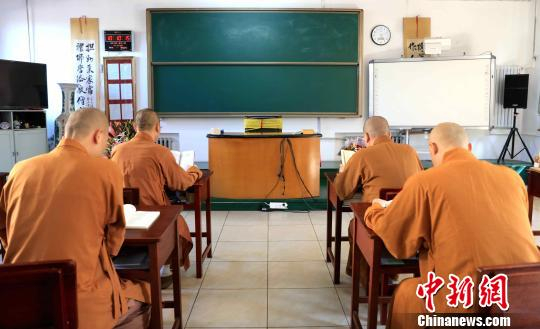 图为学僧在教室内课件自习 王舒 摄