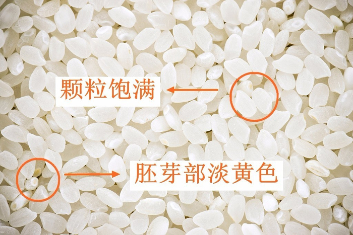 新米的色泽透明,米头(胚芽部)通常呈乳白色或淡黄色,新米的胚芽通常会保留的较多一些,乳白色的小点就更加明显;而陈米经过反复加工,米头处几乎看不到乳白色胚芽,只留下一个小缺口,另外陈米的颜色会变深呈咖啡色。