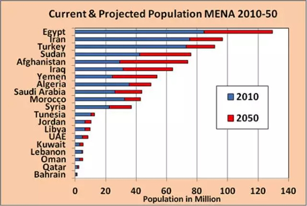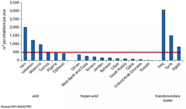 据统计,在全球15个最缺水的国家中,其中有12个位于中东和北非地区,包括阿尔及利亚、利比亚以及沙特、也门等。中东目前平均人口增长率不断上升,已达到2.5%,这也导致地区人均用水量从1962年的2925立方米减少至2011年的743立方米,这远远低于联合国制设定的7240立方米的贫水线标准。