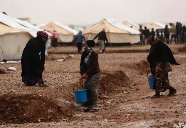 流离失所的伊拉克人为家人取水的场景(2016年摄)