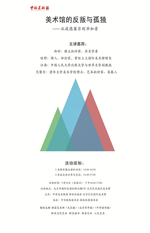 “今天的革命者就是明天的经典大师”,我们如何定义经典?经典是反叛者的代名词吗?是否只有反判才能传世?诸如波德莱尔的吸毒、梵高的割耳、毕加索的风流韵事、普鲁斯特的神经衰弱、杜尚的神秘游离等等,可能我们能直接定义现代主义的范围,在这个大众传媒如此发达的时代,艺术的界限已经模糊,问题存在在哪里?9月10日,一起来听听学者和艺术家们的看法。