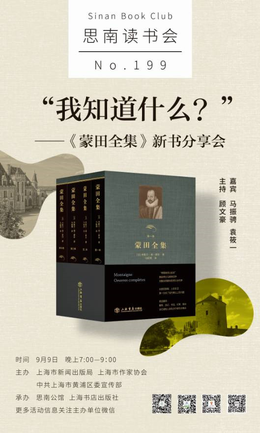蒙田(1533-1592)是法国文艺复兴后重要的人文主义作家,启蒙运动前的一位知识权威和批评家,也是一位人类感情的冷峻的观察家,一位对各民族文化,特别是西方文化进行冷静研究的学者。他从人文主义出发,更多指出人与生俱来的弱点与缺陷,要人看清自己是什么,然后才能正确对待自己、他人与自然,才能活得自在与惬意。蒙田要追问“我知道什么”,并教我们如何学会“光明正大地享受自己的存在”。本期思南读书会,邀请到《蒙田全集》翻译者马振骋先生、著名翻译家袁筱一女士,来和读者一起走近蒙田的思想文学世界。