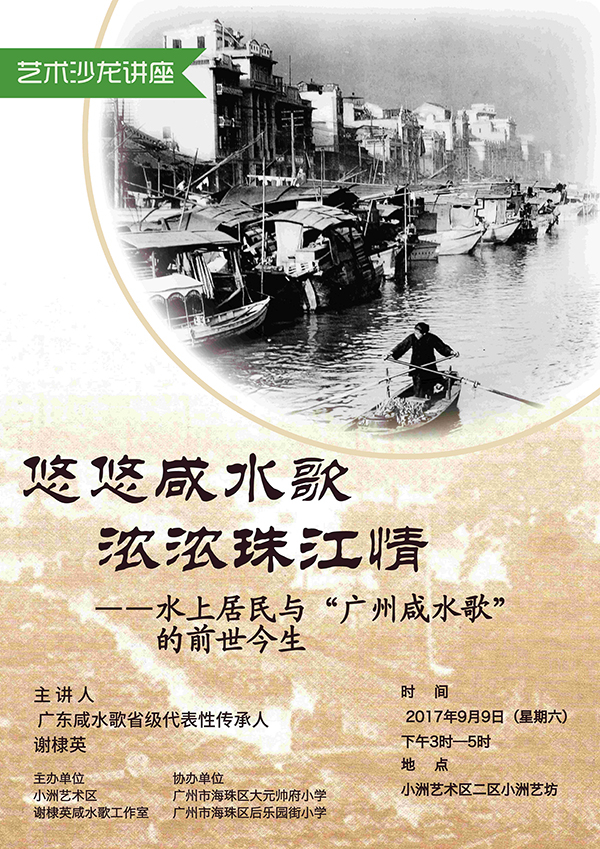 在讲座中,将通过呈现泛黄的疍家历史照片、聆听独具岭南水乡特色的咸水歌、展示原生态的疍家服饰等途径,广东咸水歌省级代表性传承人谢棣英带您一起领略水上居民(旧时称之为“疍民”)的酸甜苦辣和广州咸水歌的前世今生!