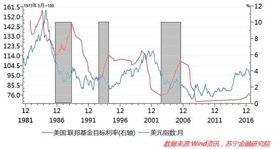 短期看,美联储货币政策的确会影响美元汇率的预期,但长周期内就显得不那么重要了。如在1986-1988年加息周期、1993-1994年加息周期、2006年加息周期中,美元指数均呈现持续回落的态势(参见下图)。同样,当前美联储仍处于加息周期中,但今年以来美元指数却持续回落。