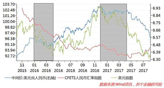 在没有引入逆周期因子之前的两轮美元贬值过程中,人民币保持对美元汇率相对稳定,而人民币汇率指数(CFETS)则一路下行(参见下图)。