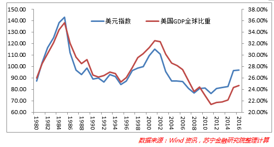 答案可能是美国经济的基本面,从下图中可看出,数十年来美国GDP占全球的比重与美元指数的走势接近重叠。但是不可否认的趋势是,不同阶段美国GDP全球份额会回升,但回升的力度越来越弱,同样,美元指数的阶段性高点则越来越低。