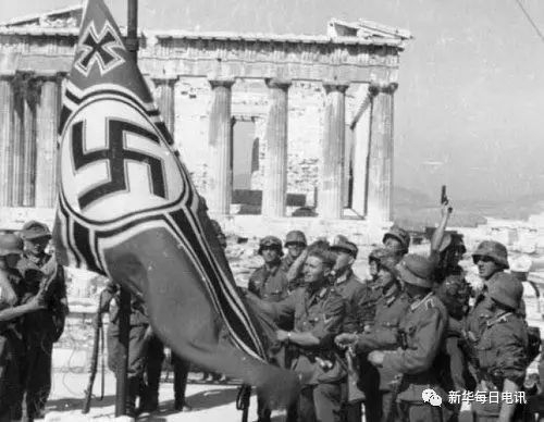 德军直接开到达希腊的国家象征——雅典卫城,升起纳粹旗帜。史载,希腊士兵降下希腊国旗后,拒绝交给入侵者,毅然抱着国旗,从雅典卫城跳下。