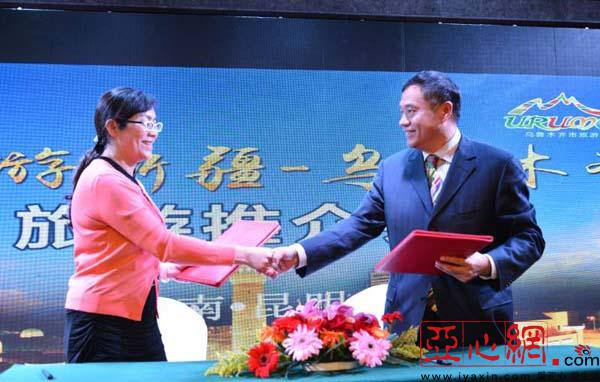 推介会现场,乌鲁木齐市旅游局和昆明市旅发委就积极推动两地旅游资源开发,实现优势互补、客源互济达成协议。
