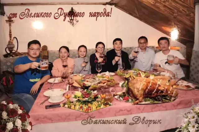 2017年8月29日,莫斯科,王惠明带领员工去俄罗斯参加展会,恰逢七夕于是组织员工聚餐。右三为王惠明。