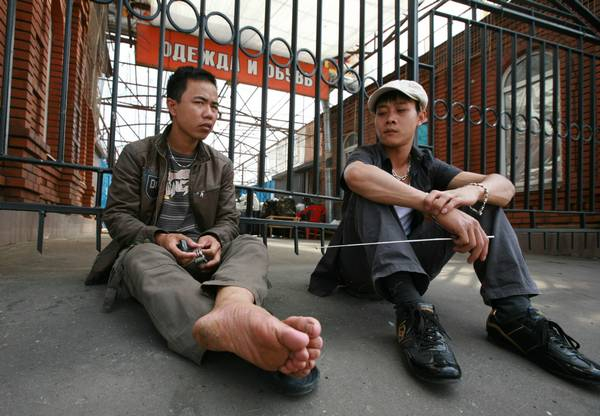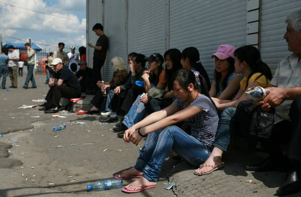 2009年7月12日,莫斯科,切尔基佐夫市场关闭导致众多原先在市场里工作的移民工人失业。