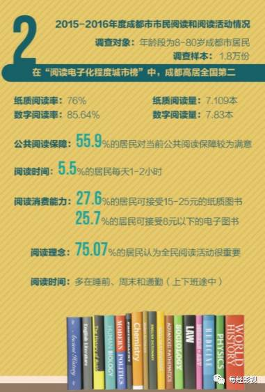 亚马逊中国发布的《2017全民阅读报告》显示,成都的电子书阅读率、购买付费电子读物、社交平台分享等数据均高于全国平均水平,在“阅读电子化程度城市榜”中,成都高居全国第二。
