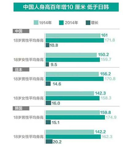 过去一百年里,中国男性身高平均增长了10.8厘米,女性平均增长了9.5厘米,然而同日、韩相比,国人的身高增长却在“回落”,增幅低于韩国的一半!