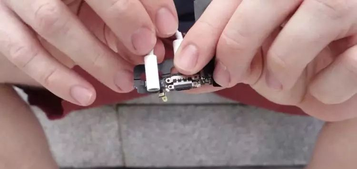 拿出新买的耳机接口,稍微裁剪一点,就可以放进手机。不过似乎会挤压到原有零件的生存空间。