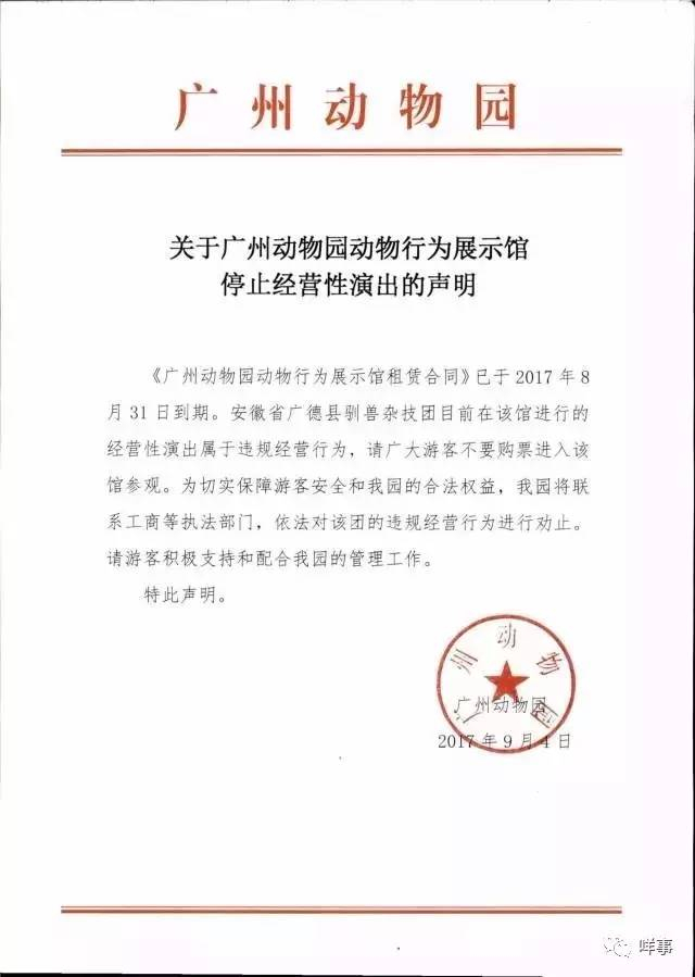 ● 9月4日,广州动物园表示,目前在该馆进行的经营性演出属于违法经营行为,请广大游客不要购票进入该馆参观,该园将联系工商等执法部门,依法对经营方进行劝退。