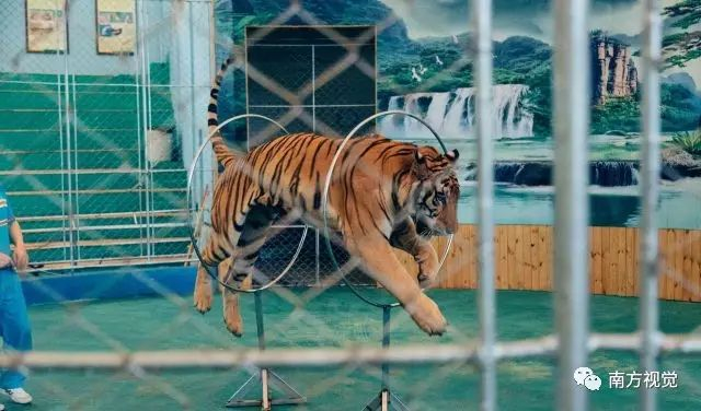 一只老虎在表演跳铁环。停止演出后,这些马戏团的国家级保护动物的去处也是一个严峻的问题。