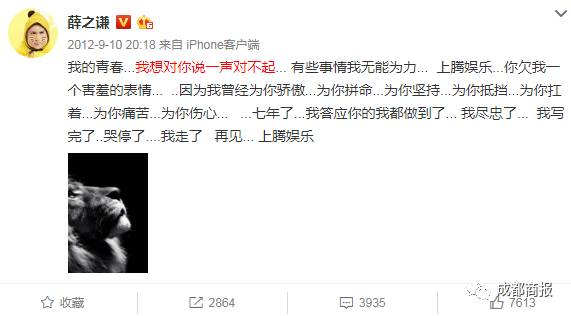 2012年9月10日,薛之谦结束了和上腾娱乐的七年合约,在访谈中,他说自己可能是同期《我型我秀》出道选手中,“唯一一个完成七年合约的人”“如果没有我型我秀,可能连红的机会都没有”,合约结束感叹发文“我的青春,我想对你说一声对不起”。
