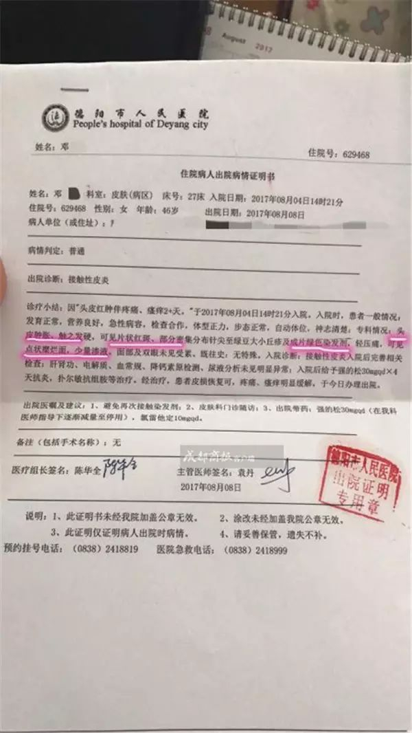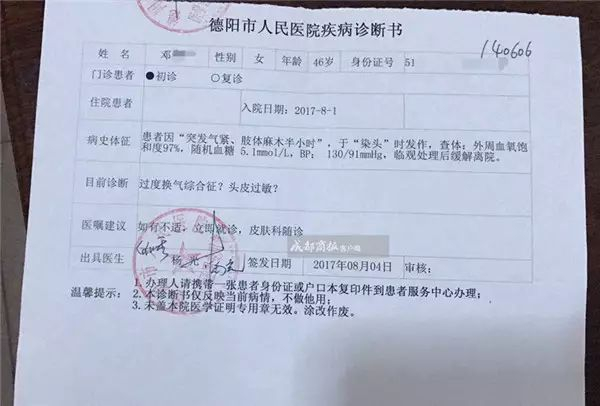 后来医院诊断为:过敏性休克,头皮烧伤,头皮残留染料高达整个头皮的40%。