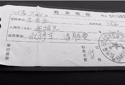 9月6日一大早,李先生去小区物业要来了一张收据,上面盖有“杭州瑞飞物业”的公章,收款事由为“乱停车 清脏费”。更奇怪的是,收据上填写的日期却是“2017年8月4日”。